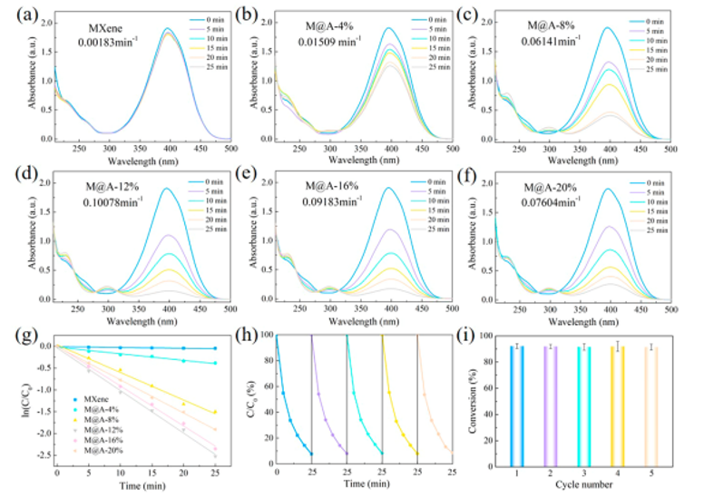 x MXene膜和M@A膜催化劑的反應時間(min)與ln(C/C0)的關系。(h-i) M@A-12%膜催化劑用于4-NP催化還原反應的循環(huán)催化。