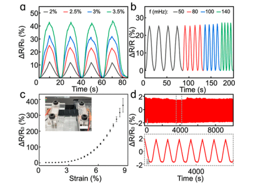 圖2.LIG應變傳感器的特性。(A)阻力隨時間的變化,表現出穩定性和敏感性。(B)電阻隨時間的變化,描述頻率靈敏度。(C)電阻與應變圖的變化,描繪了傳感器靈敏度(標尺=1厘米)。(D)測量LIG應變傳感器在1000個循環內的重復性。