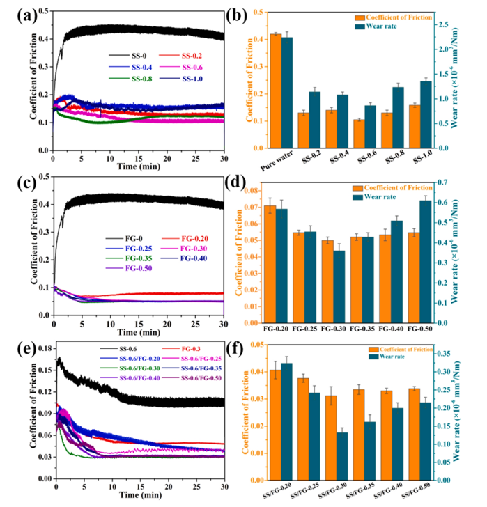 圖6. 具有不同濃度相應添加劑的潤滑劑在設定條件(20N,2Hz,6mm)下的摩擦系數曲線和磨損率:(a,b)SS,(c,d)FG/CTAC和(e,f)SS/FG。