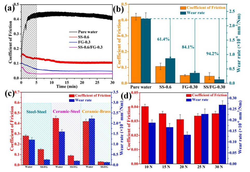 圖7. (a)在設定條件下(20 N, 2 Hz, 6 mm),純水和各種潤滑劑0.6 wt% SS, 0.3 wt% FG/CTAC, SS/FG混合潤滑下的摩擦系數曲線和(b)磨損率;不同(c)摩擦對和(d)載荷下SS/FG潤滑劑的摩擦系數和磨損率。