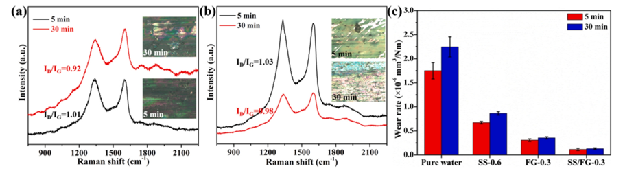圖8. (a) FG/CTAC和(b)添加潤滑劑的SS/FG潤滑黃銅基片,摩擦5min和30 min后形成的潤滑膜的拉曼光譜, (c)在設定條件下(20 N, 2 Hz, 6 mm)添加不同添加劑的潤滑劑經過不同摩擦次數后的磨損率比較。