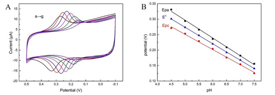 圖3. (A) NiO/CoO@PCNs/CNTs/erGO/GCE在含5 μM DA的0.1 M PBS中不同pH值(a ~ g: 4.5、5.0、5.5、6.0、6.5、7.0、7.5)下的CVs。(B)氧化峰電位(Epa)、式電位(E