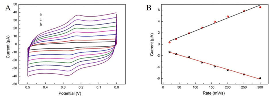-1)下的CVs。(B)氧化還原峰值電流與掃描速率(v)的關系。