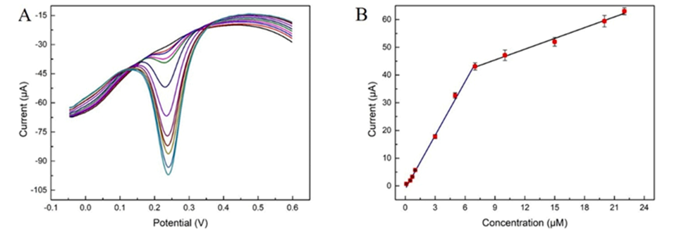 圖5. (A)在0.1 M PBS (pH 5.5)中,DA范圍為a ~ i(0.1、0.5、0.7、1.0、3.0、5.0、7.0、10.0、15.0、20.0、22.0 μmol/L), NiO/CoO@PCNs/CNTs/erGO/GCE的DPVs;(B)電流響應與DA濃度線性校準的DPVs。