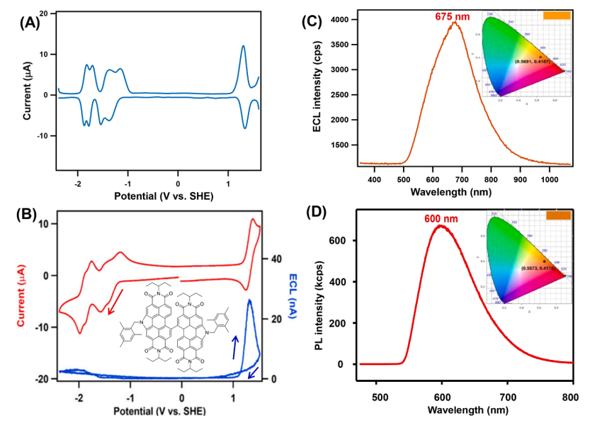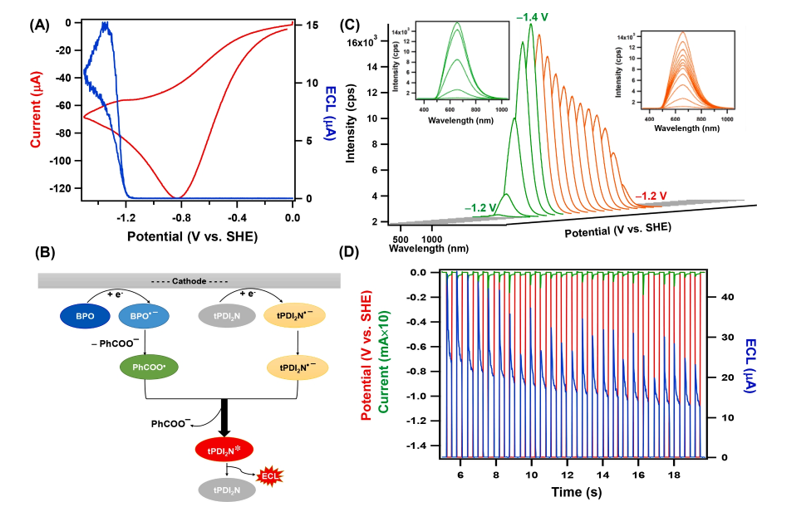 2N -TMB的分子結構。(C)電位脈沖實驗的累積ECL譜。(D) 0.03 mM tPDI