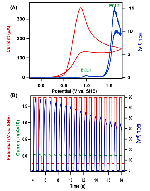 2N-TMB,20 mM TPrA,-0.5和1.80 V之間的電位脈沖實驗,頻率為10 Hz。