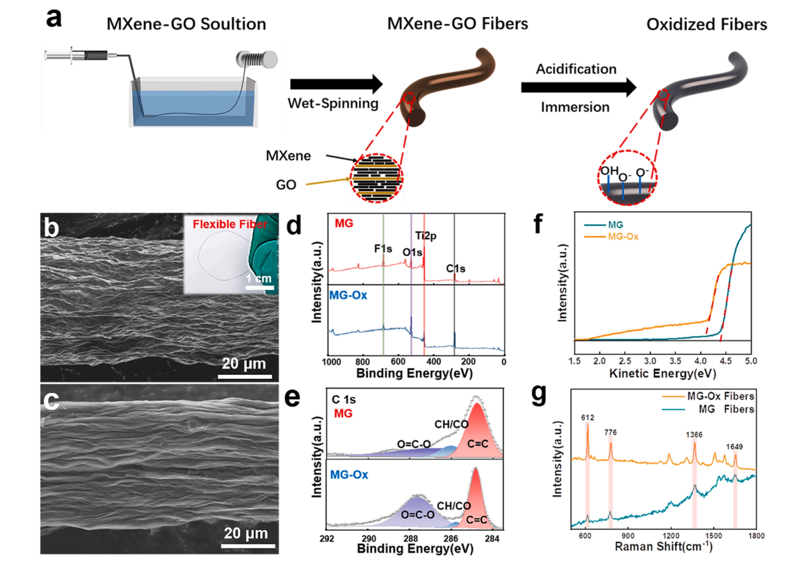 圖1. (a) MG-Ox纖維濕法紡絲和酸化法的示意圖。(b) MG和(c) MG-Ox纖維的SEM圖像,以及相應的XPS測量光譜(d)和高分辨率Cl s光譜(e)。(f) MG和MG-Ox纖維的UPS光譜。(g) 1 × 10