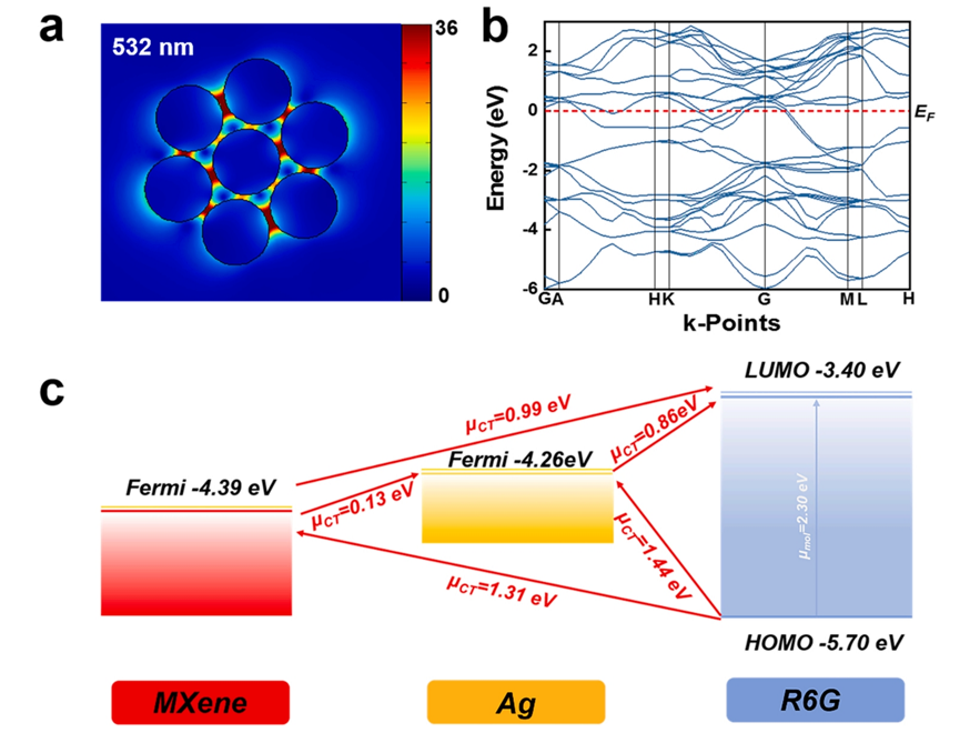 圖5. (a) MG纖維上單層AgNPs納米結構的電場分布。(b) MXene的能帶結構。(c) MG/AgNPs-PVP纖維與R6G分子的CT過程示意圖。