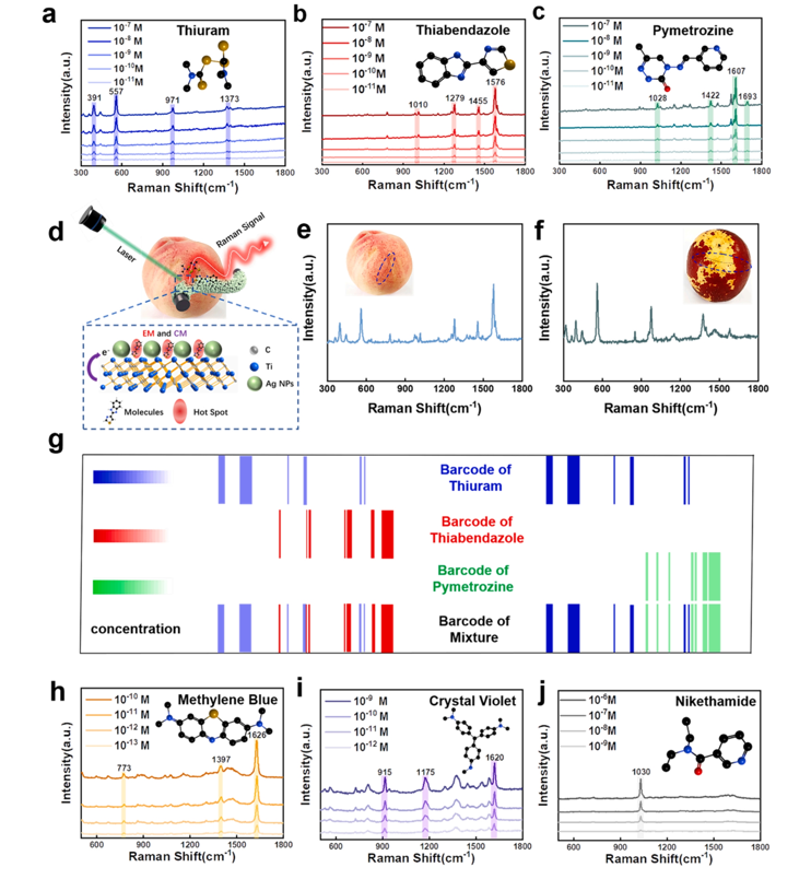 -11 M范圍內的SERS檢測。(d)柔性MG/AgNPs-PVP纖維多路農藥檢測示意圖。混合農藥在(e)桃和(f)冬棗表面的SERS譜。(g)每種農藥的單獨條形碼和混合農藥的疊加條形碼。從(h)亞甲基藍、(i)結晶紫和(j)尼可剎米中收集的SERS光譜。