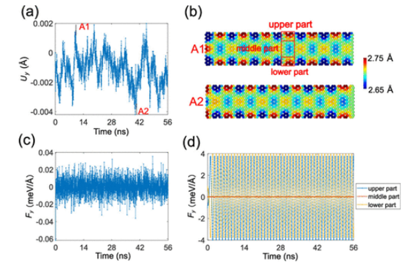 y0=0時,GNR的位移-時間圖,Y≈2.2 nm。(b) GNR的兩種瞬時GNR形態(tài)。對于A1中紅框內(nèi)的半莫爾圖案,它可以分為三部分。(c) Fy–紅框內(nèi)半莫爾條紋圖案的時間圖。(d) F