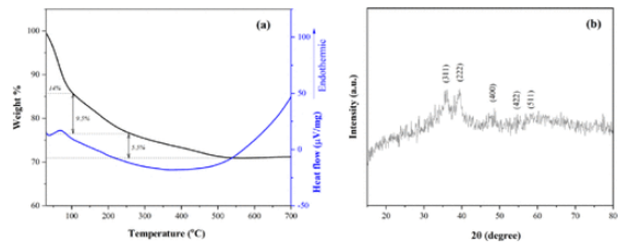 圖2.(a) TGA和DTA曲線以及(b)CFSG的XRD圖譜。
