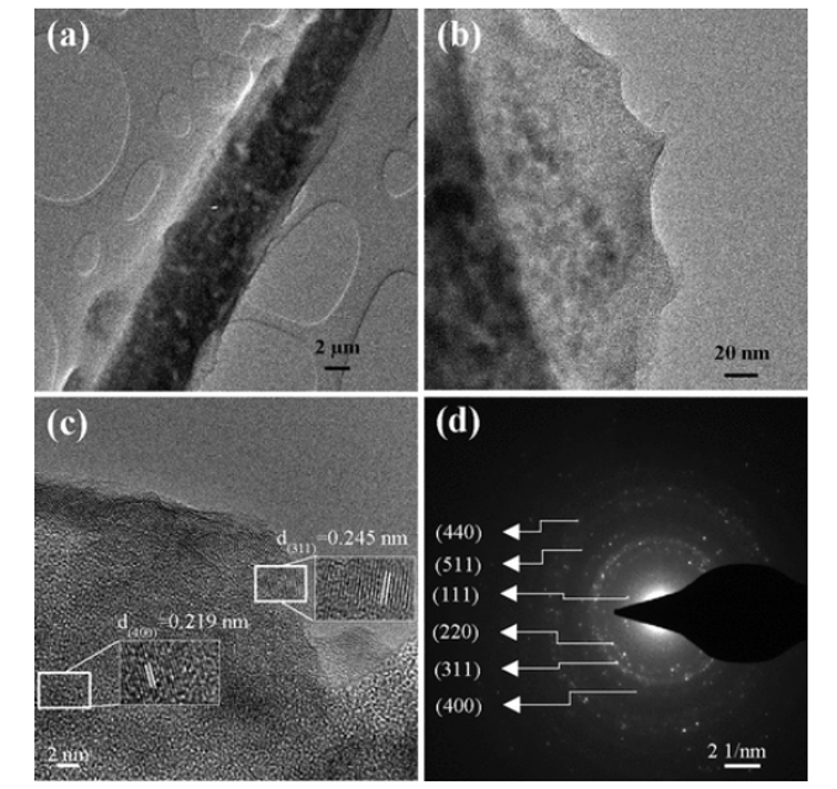 圖4.(a,b)不同放大率下的TEM圖像,(c)HR-TEM圖像,以及(d)CFSG的SAED圖案。