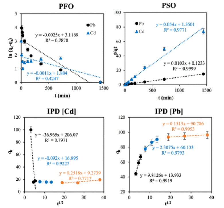 圖7.實驗數(shù)據(jù)與PFO、PSO和IPD對Cd(II)和Pb(II)吸附的動力學(xué)擬合。