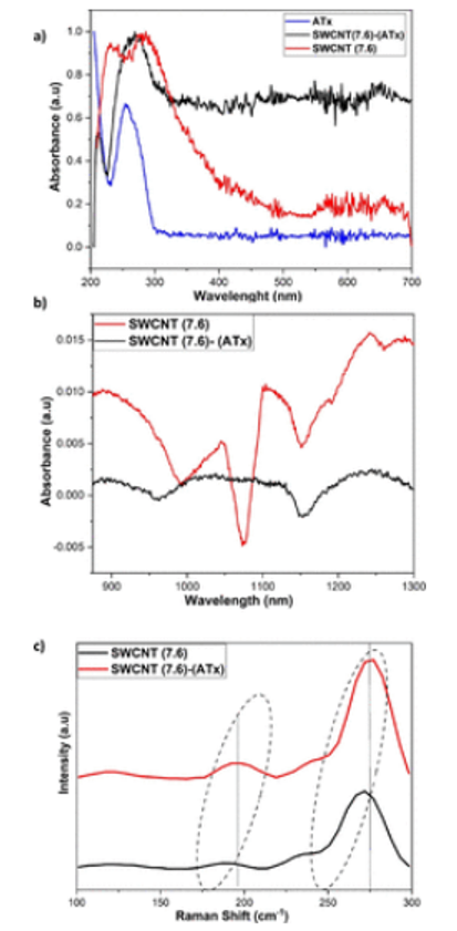 圖2.紫外-可見光譜測量(a)、nIR光譜(b)和(c)SWCNT(7.6)和SWCNT的拉曼光譜(100–300 cm–1)結果-(AT)x出現在電暈后相峰。