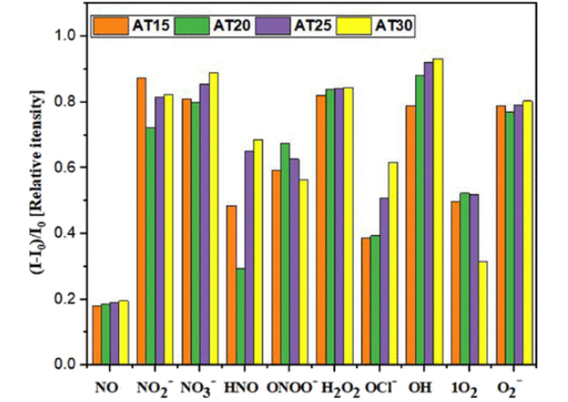 半導體單壁碳納米管(s-SWCNT)是在近紅外區域發出熒光的結構。通過用聚合物材料如單鏈DNA涂覆SWCNT表面,在試劑存在的情況下發生熒光發射的變化。通過這種方式,聚合物涂覆的SWCNT結構允許它們用作單分子檢測的光學傳感器。特別是今天,細胞分子檢測方法的不足使得癌癥等疾病的早期診斷在單分子水平上變得困難。在這項研究中,在單分子水平上檢測作為癌癥標志物的一氧化氮(NO)信號。在這種情況下,通過用具有不同寡核苷酸長度(AT)的ssDNA涂覆7,6-手性s-SWCNT表面來形成傳感器結構。利用紫外-可見光譜和拉曼光譜顯微鏡對傳感器結構進行了表征。在傳感器結構形成后,使用各種分子創建選擇性文庫。由于SWCNT(7,6)表面的DNA電暈相形成,觀察到195和276 cm–1處的拉曼峰向右移動。此外,選擇性文庫結果表明(AT)30序列可用于NO檢測。使用SWCNT(7.6)-(AT)30進行的研究結果表明,該傳感器對NO的檢測限(LOD)和測定限(LOQ)值分別為1.24和4.13μM。