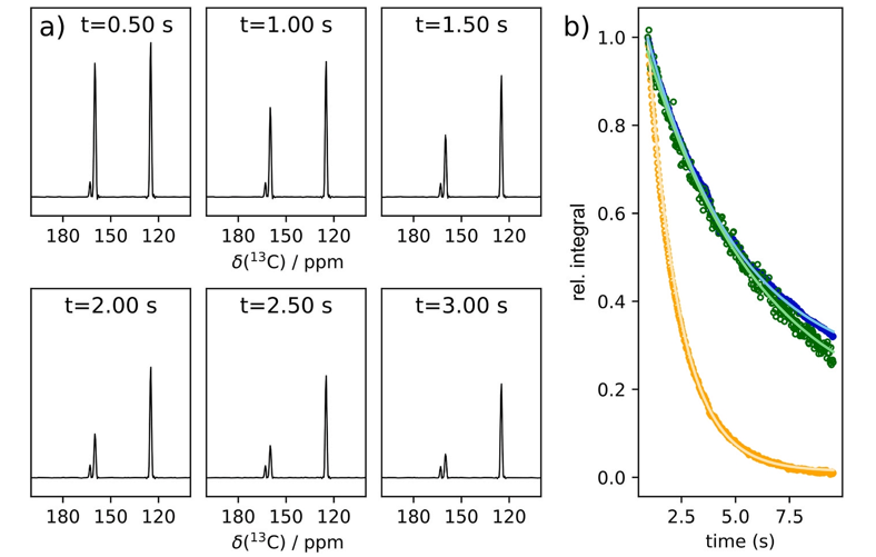 13C核磁共振譜時間分辨切片。b) 159.5 ppm處結合峰的歸一化時間相關峰積分的擬合(黃色;底部)和游離CO