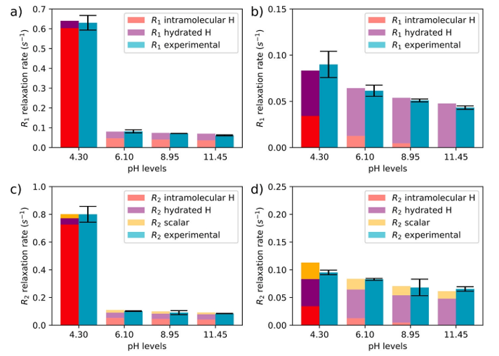 2弛豫速率,并確定了結合物質為碳酸及其共軛物。一個物質結合態和自由態弛豫速率有顯著差異,表明是可逆結合。除了弛豫速率外,還從小翻轉角實驗中擬合了動力學速率常數,并與理論計算進行了比較。pH相關的吸附和解吸速率常數分別為3.5 ~ 9.5和0.7 ~ 2.0 s