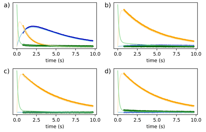 2(aq)峰(藍色)、結合峰(黃色)和游離峰(綠色)積分疊加的擬合曲線,pH為 a) 4.30, b) 6.10, c) 8.95和 d) 11.45。以混合開始作為零時間標記,生成相應的擬合曲線(淺色)。