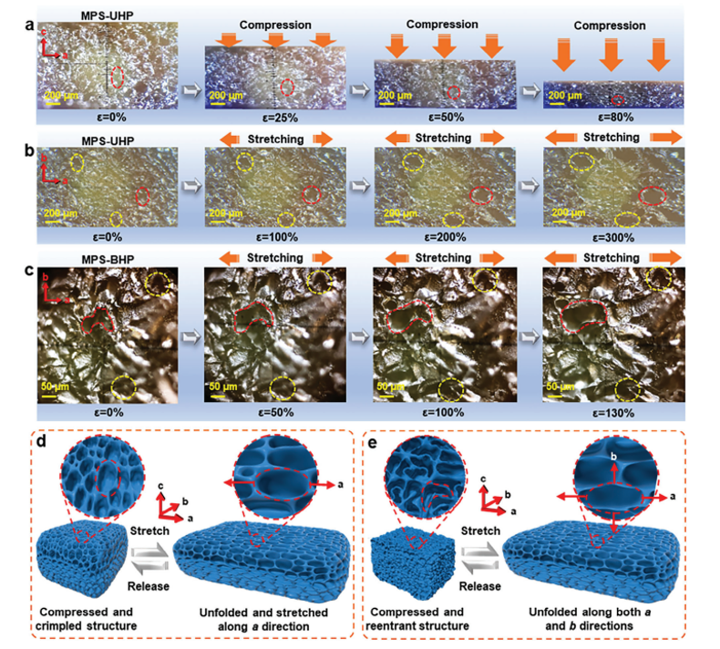 圖4. 壓縮和拉伸時MPS-UHP和MPS-BHP的原位形貌。