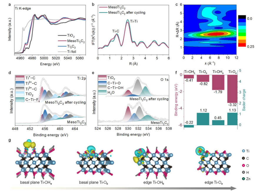 鋅金屬基水性電池(ZABs)提供了一種可持續(xù)的、負擔得起的、安全的鋰儲能替代品,但不可避免的枝晶形成阻礙了其廣泛應(yīng)用,特別是在長期和高速率的循環(huán)下。在樹突形成后,電池如何存活仍然是一個懸而未決的問題。在這里,我們從傳統(tǒng)的抑制Zn枝晶生長策略轉(zhuǎn)向,通過介孔Ti3C2 MXene (MesoTi3C2)包裹聚丙烯分離器引入主動的枝晶消化化學。光譜表征和電化學評價表明,MesoTi3C2作為一種氧化劑,可以通過自發(fā)的氧化還原過程使已形成的死Zn0枝晶恢復(fù)為電活性Zn2+離子。密度泛函理論表明,我們的MesoTi3C2中豐富的邊緣Ti-O位點促進了Zn0枝晶的高氧化性和電子轉(zhuǎn)移。在實際電流為5 mA cm−2和低過電位(<50 mV)的情況下,產(chǎn)生的不對稱電池顯示出2200小時的顯著超長周期壽命。該研究揭示了介孔MXenes意想不到的邊緣效應(yīng),并揭示了一種新的主動的樹突消化化學,以使ZABs存活,盡管不可避免地會形成樹突。