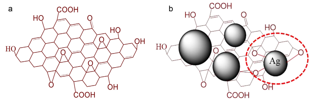 圖1. (a)GO和(b)AgNPs@GO的結構。