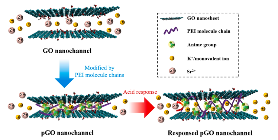 從放射性廢水中分離核素對核廢料的安全處置和資源的可持續發展至關重要。然而,由于放射性廢水中復雜成分的高酸性和高鹽性,其仍然面臨著很大的挑戰。本文研究了一種pH響應型氧化石墨烯膜(pGO膜),用于從含有多種混合鹽離子的高酸性放射性廢水中快速高效地分離Sr2+核素離子。與傳統氧化石墨烯膜不同的是,由于修飾后的pGO納米通道內存在接枝分子聚乙烯亞胺(PEI),因此pGO膜的層間間距可以隨著周圍溶液酸度的增加而調節和增加。由此產生的酸性環境適應性膜在高酸性溶液中具有擴大和帶正電的納米通道。這種結構有效地阻斷了較大且高電荷的水合Sr2+核素離子,同時允許較小且低電荷的單價鹽離子(如Cs+, K+, Na+)快速通過膜運輸。結果表明,pGO膜對Sr2+/單價鹽離子具有高選擇性,對單價離子具有高滲透性。總之,這項工作為高酸性溶液中放射性核素的分離提供了一種新的篩分方法。
