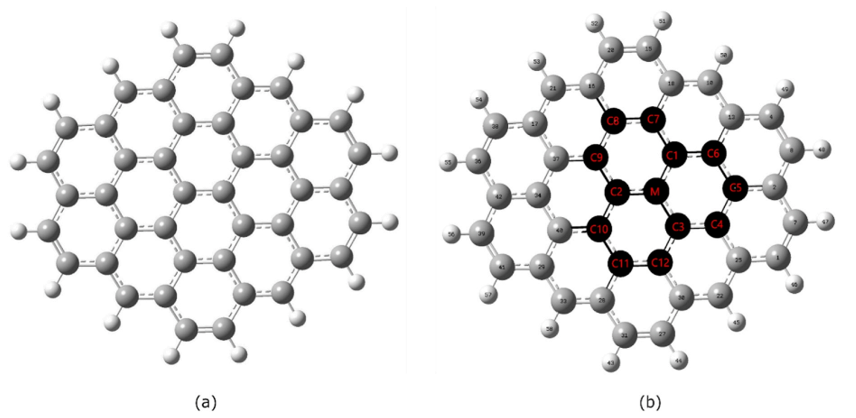 圖1. (a) 石墨烯的優化構型(b)M代表摻雜在P-Gr中的金屬。
