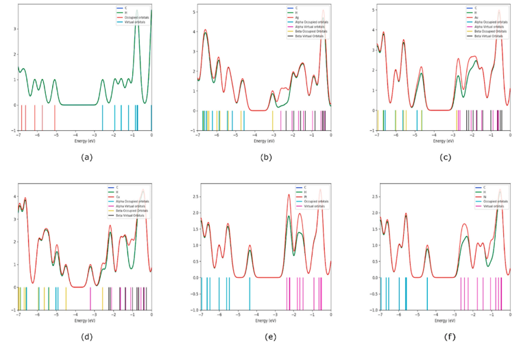 圖4. 使用B3LYP/LANL2DZ的原始和金屬摻雜石墨烯系統的PDOS光譜。