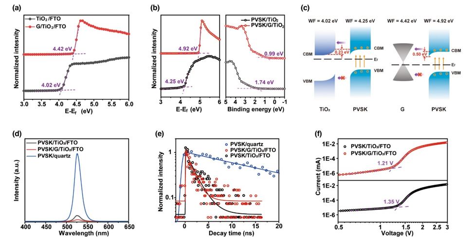 Fig 3. a) TiO2/FTO 和 G/TiO2/FTO 的 WF; b) CsPbBr3在TiO2/FTO和G/TiO2/FTO上的功函數(shù)(WF)和價帶最大值(VBM); c) 鈣鈦礦和ETL界面的能帶結構;所制備的鈣鈦礦薄膜的 d) PL、e) TRPL 和 f) SCLC。