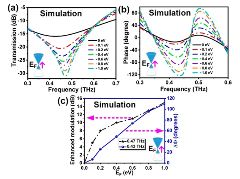 圖2. (a) 模擬的透射光譜和(b)具有不同費米能級的相光譜。(c) 模擬了不同費米能級的增強因子和相位差。