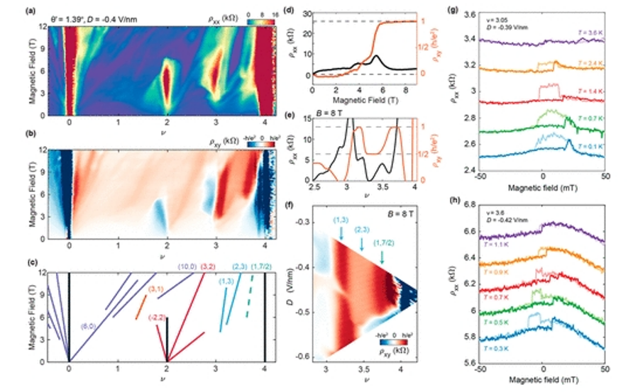 圖1. 在兩種堆疊配置中,在tDBG中觀察到的相關(guān)相位和拓?fù)湎辔坏膶哟?。(a,b)AB–AB和AB–BA tDBG的側(cè)視圖晶格示意圖。AB–AB(AB–BA)tDBG由兩個(gè)具有相同(相反)取向的Bernal堆疊石墨烯雙層組成。(c) 計(jì)算出θ=1.2°(AB–AB,實(shí)線)和θ′=1.2°的能帶結(jié)構(gòu)(AB–BA,虛線)tDBG,層間電位δ=40meV。紅色帶表示最低莫爾導(dǎo)帶。AB–AB(AB–BA)疊加中的Chern數(shù)為C=2(1)。(d,e)θ=1.34°(AB–AB)和θ′=1.39°(AB-BA)裝置的電阻率ρxx圖。測(cè)量是在T=2K和零磁場(chǎng)下進(jìn)行的。插圖顯示了|B|=0.5T時(shí)放大的霍爾系數(shù)RH,重點(diǎn)關(guān)注相關(guān)狀態(tài)。(f) 在13個(gè)tDBG器件中觀察到的相關(guān)和拓?fù)錉顟B(tài)的總結(jié)。相關(guān)的絕緣狀態(tài)、表現(xiàn)出AHE的狀態(tài)和SBCI狀態(tài)分別用圓形、方形和三角形標(biāo)記表示。AB–AB(AB–BA)堆疊由開(kāi)放(閉合)標(biāo)記表示。綠色和橙色陰影表示觀察到對(duì)稱(chēng)性破壞金屬態(tài)的扭曲角度范圍,通過(guò)低場(chǎng)霍爾效應(yīng)中的符號(hào)反轉(zhuǎn)來(lái)識(shí)別。由(C,s)表示的狀態(tài)對(duì)應(yīng)于在磁場(chǎng)中觀察到的SBCI。