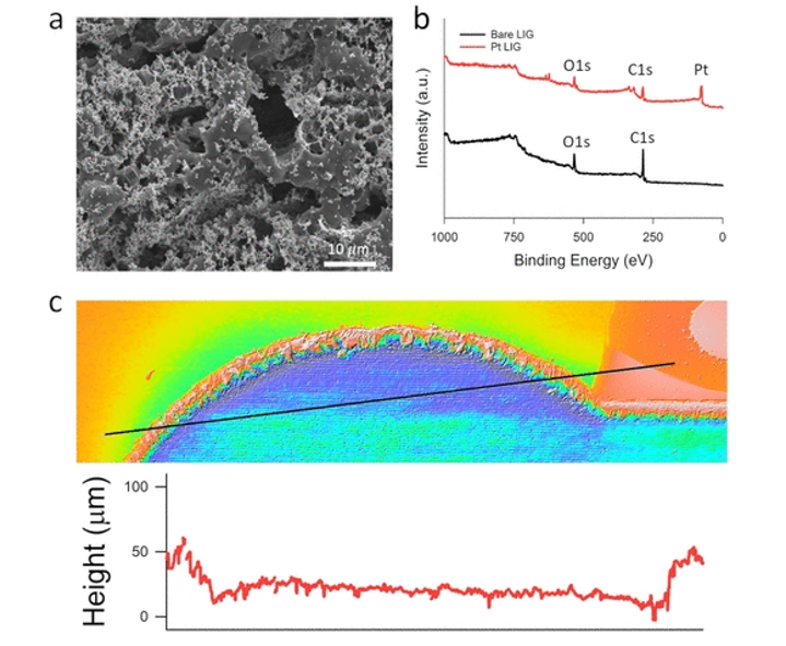圖2. (a) 顯示LIG多孔表面上的鉑納米顆粒的SEM圖像。(b) 裸LIG(黑色)的XPS調(diào)查顯示典型的O1s和C1s峰,鉑LIG(紅色)顯示減少的O1s、C1s峰和額外的Pt峰。(c) 使用Sensofar的S-neox系統(tǒng)拍攝的裸LIG電極的3D顯微鏡圖像顯示了材料的3D結(jié)構(gòu),其平均高度約為-25μm。