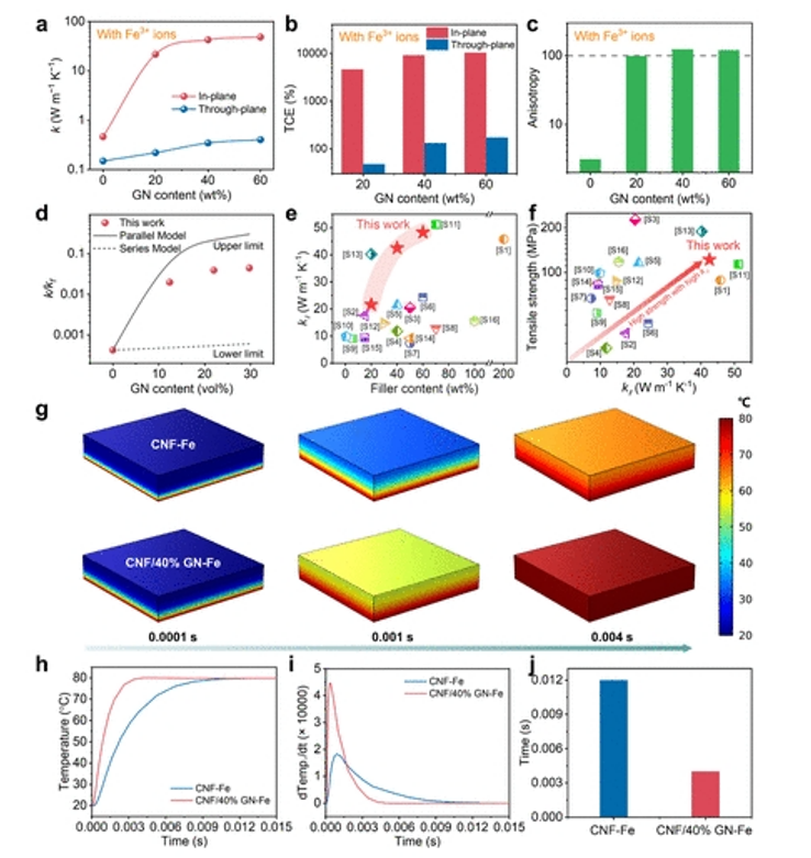 ⊥分別表示薄膜的平面內和平面內導熱系數。(d)基于實驗數據的CNF/GN-Fe生物復合膜的熱增強效率(k/k