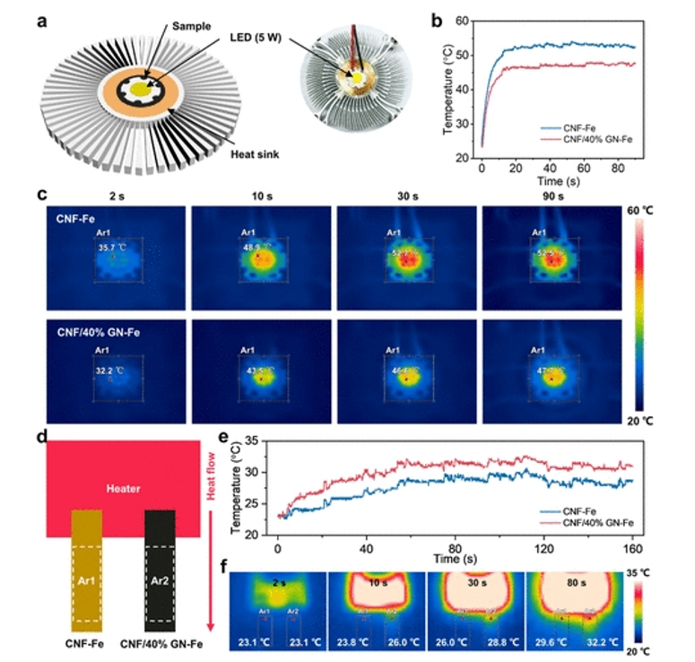 (d) CNF- Fe和CNF/40% GN-Fe膜的面內傳熱示意圖。(e)薄膜溫度隨加熱時間的變化及(f)相應的熱紅外圖像。