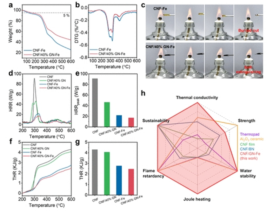peak, (f) THR曲線,(g) THR值。(h) CNF/GN-Fe生物復合膜與其他典型材料的比較,包括商用熱敏墊、Al