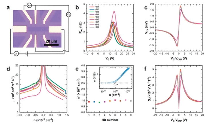 圖2: 芯片1的電傳輸特性。(a) 典型運輸測量的電氣圖。(b) 電阻率是所施加的柵極電壓的函數。不同的顏色代表九個不同的霍爾酒吧。(c) 霍爾電壓作為相對于CNP施加的柵極電壓的函數。(d) 作為載流子密度函數的載流子遷移率。(e) CNP處的電荷不均勻性。插圖:代表性器件(HB2)的電導率是雙對數標度上載流子密度的函數。使用線性擬合來獲得n*。(f) 電流相關靈敏度是在B~0.37T下獲得的施加柵極電壓的函數。