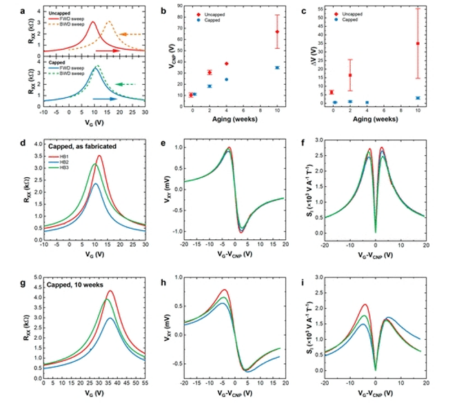 圖3. 沒有和有PMMA封裝的石墨烯霍爾棒的電學特性。(a)電阻率測量作為外加柵極電壓函數的遲滯。(上圖)未封頂大廳酒吧:向前(紅色實線)和向后(橙色虛線)后門掃。(下)PMMA覆蓋的大廳條:向前(藍色實線)和向后(綠色虛線)后門掃描。(b) CNP的位置和(c)未封頂(紅色)和封頂(藍色)石墨烯器件的滯回率隨老化時間的變化。(d - f) PMMA封裝后芯片3的電性能,顯示電阻(d)、霍爾電壓(e)和電流相關靈敏度(f)作為外加柵極電壓的函數。(g - i)芯片3老化10周后的電性能,顯示電阻(g)、霍爾電壓(h)和電流相關靈敏度(i)隨外加柵極電壓的變化。