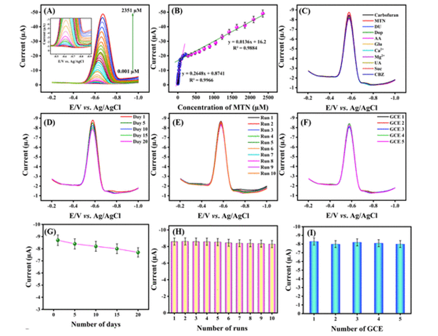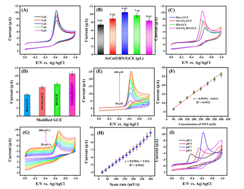 圖7. 改變MTN量(0.001–2351μM)的DPV響應(yīng)(A)以及MTN濃度(μM)與電流(μA)的相應(yīng)線(xiàn)性相關(guān)性圖(B)。在100μM MTN存在下,DPV響應(yīng)、選擇性(C)、儲(chǔ)存穩(wěn)定性(D,G)、重復(fù)性(E,H)和再現(xiàn)性(F,I)的曲線(xiàn)圖和條形圖。所有實(shí)驗(yàn)均在PBS(pH=7.0;0.05M)中的SrCoO3/BN改性GCE中進(jìn)行。