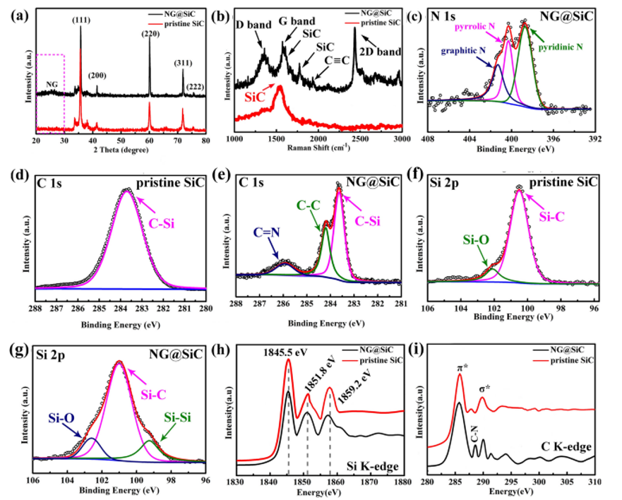 Fig 3. a 分別是原始 SiC和NG@SiC 的 XRD和b拉曼光譜。XPS 譜:NG@SiC 的 c N 1s。分別為原始 SiC 和 NG@SiC 的 d, e C 1s 和 f, g Si 2p。原始 SiC 和 NG@SiC 的 h, i Si K 邊和C K邊XANES光譜。