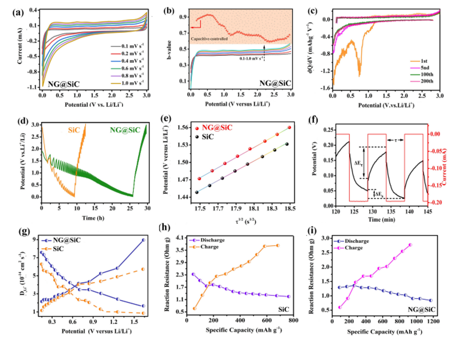 1/2 之間的關系。 f GITT 滴定曲線圖解。 g 根據(jù)GITT計算的鋰離子擴散系數(shù)。 h, i 原始 SiC 陽極和 NG@ SiC 陽極的反應電阻。