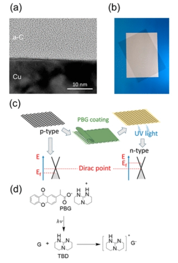 圖1. (a) 石墨烯在銅襯底上的橫截面TEM圖像。(b) 石墨烯在PET基板上的照片,尺寸為A4。(c) 使用PBG和UV照射將石墨烯從p型摻雜轉(zhuǎn)換為n型摻雜的實驗過程的示意圖。通過層壓將PBG涂覆在石墨烯基板上,并且從基板側(cè)施加UV照射。(d) 顯示石墨烯的光誘導(dǎo)電子摻雜的方案(表示為G)。在紫外線照射過程中,PBG發(fā)生脫羧反應(yīng),釋放出堿TBD。此外,TBD將電子轉(zhuǎn)移到石墨烯晶格。