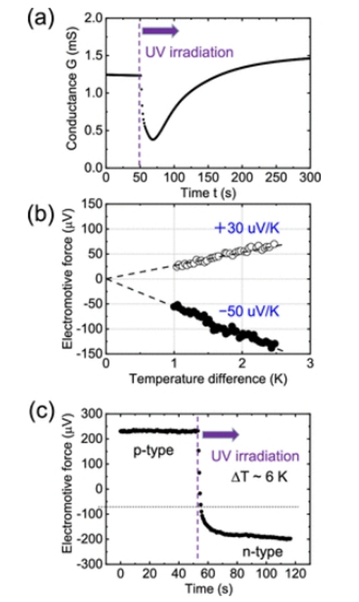 圖2. (a) 石墨烯PBG膜電導(dǎo)隨紫外線照射時間的變化。圖顯示了紫外線照射的起點。(b) 初始石墨烯膜(開放圓)和PBG-UV處理后(閉合圓)的塞貝克系數(shù)測量結(jié)果的比較。(c) 在6 K的溫差下原位測量石墨烯PBG膜中的電動勢。圖顯示了紫外線照射的起始點。
