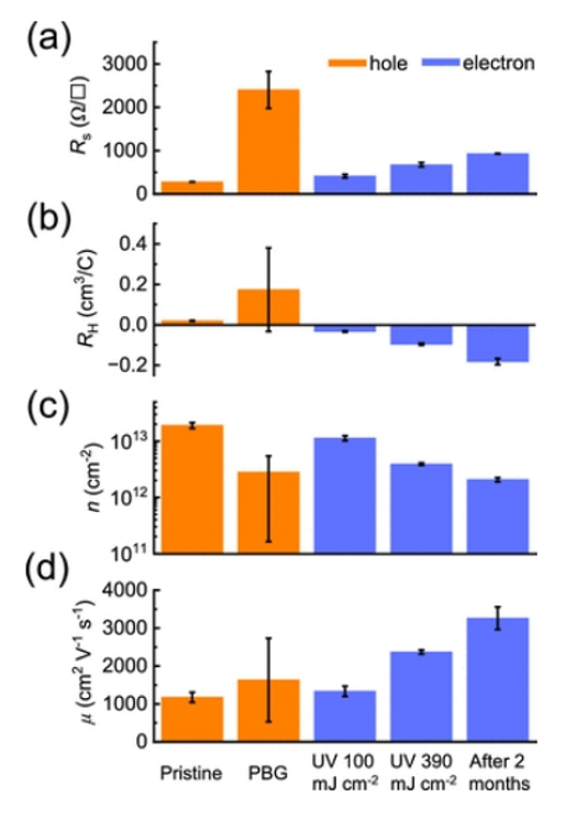 -2的紫外線輻照的PBG涂層石墨烯以及兩個月后的同一樣品的霍爾遷移率(μ)值。