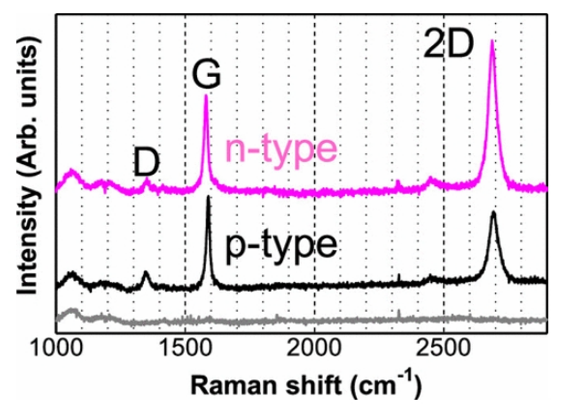 圖4. 石英襯底(灰色線)、原始石墨烯(黑色線)和紫外線照射的PBG涂層石墨烯(粉紅色線)的拉曼光譜。對于UV照射的PBG涂覆的石墨烯,使用甲醇去除PBG層以促進(jìn)激光聚焦在石墨烯表面上。