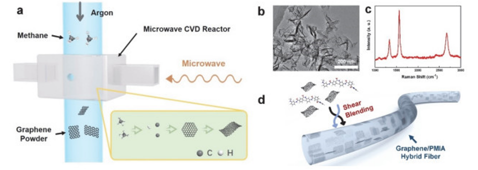 Fig 1. (a) 微波誘導石墨烯制造工藝方案; (b,c)所制備的石墨烯粉末的低倍TEM圖像和相應的拉曼光譜; (d)石墨烯/PMIA纖維的示意圖。