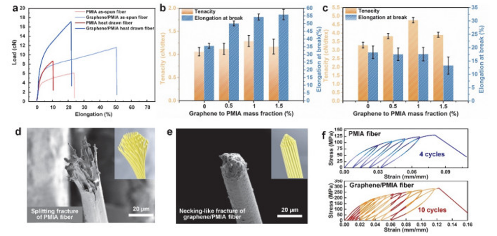 Fig 4. (a) PMIA纖維和石墨烯/PMIA纖維的典型應力應變曲線;不同石墨烯含量的初紡(b)和熱拉伸(c)石墨烯/PMIA纖維的平均最大拉伸強度和斷裂伸長率; PMIA纖維(d)和石墨烯/PMIA纖維(e)拉伸斷裂形貌比較; (f)準靜態循環加載條件下PMIA纖維和石墨烯/PMIA纖維的應力應變曲線。