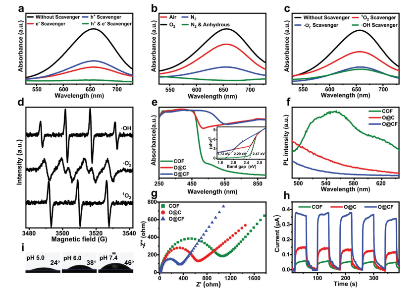 2 自旋捕獲器:TEMP。e) UV-vis-NIR DRS 光譜和相應(yīng)的 Kubelka-Munk 函數(shù)圖以及不同粉末的計算帶隙(插入)。 f) COF、O@C 和 O@CF 粉末的 PL 光譜(Ex = 350 nm)。分別是COF、O@C和O@CF的g)電化學阻抗和h)光電流響應(yīng)光譜。 i) O@CF 在不同 pH 緩沖液中處理 30 分鐘后的接觸角。