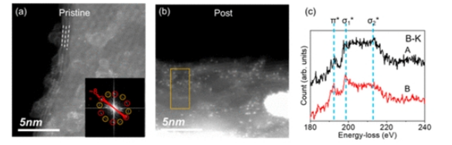 圖2. 燃料電池測試前后B-FLG的STEM圖像和電子結構。(a) 標記為原始的生長B-FLG的STEM圖像顯示莫爾條紋。插圖顯示了圖像的FFT,顯示了兩層之間的8°扭曲角。(b) 燃料電池測試后b-FLG的STEM圖像標記為Post。黃色矩形顯示,根據對比度變化,腐蝕主要發生在表面附近。(c) 來自原始(A)和后(B)樣品的B K邊緣EELS光譜的比較。