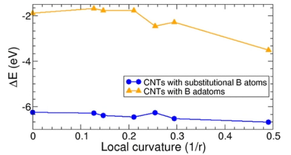 圖4. 硼摻雜劑在不同曲率碳納米管上的結合能。在這里,考慮兩種類型的摻雜劑配置,硼原子取代CNT的碳,硼作為CNT碳頂部的吸附原子,其中0和0.5的局部曲率值對應于石墨烯和(3,3)CNT。