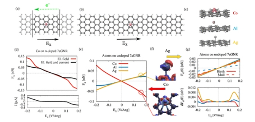 圖2. 在橫向電場中/在經歷電遷移力的有限偏壓下吸附在7-aGNR上的單原子。(a) 具有半無限大aGNR電極的7-aGNR上的Co原子。在左電極和右電極之間施加偏置電壓,從而產生電場和電流。(b) 橫向電場Ex.中有限7-aGNR上的Co原子。(c)單原子(Co、Al和Ag)在7-aGNR:Co和Al更喜歡中空位置,而Ag更喜歡頂部位置。(d) 頂部:來自(a)所示傳輸設置的Co原子上的電流和場誘導力Fx(黑線),以及來自(b)所示設置的純場誘導力(紅線)。底部:(a)在電場上流過系統的電流。(e) 電場中7-aGNR上Co、Al和Ag原子上的力。(f) 當Ex=0.15V/Å時,Ag和Co上的場誘導電荷密度。(g) 頂部:通過Hirshfeld(實線)和Mulliken(虛線)分析獲得的,在GNR上吸附時,由于Co、Al和Ag上感應的凈電荷Q(0)而產生的靜電力Fel(0)。底部:電場Ex上的場感應電荷產生的靜電力ΔFel(E)ΔQ(E)。